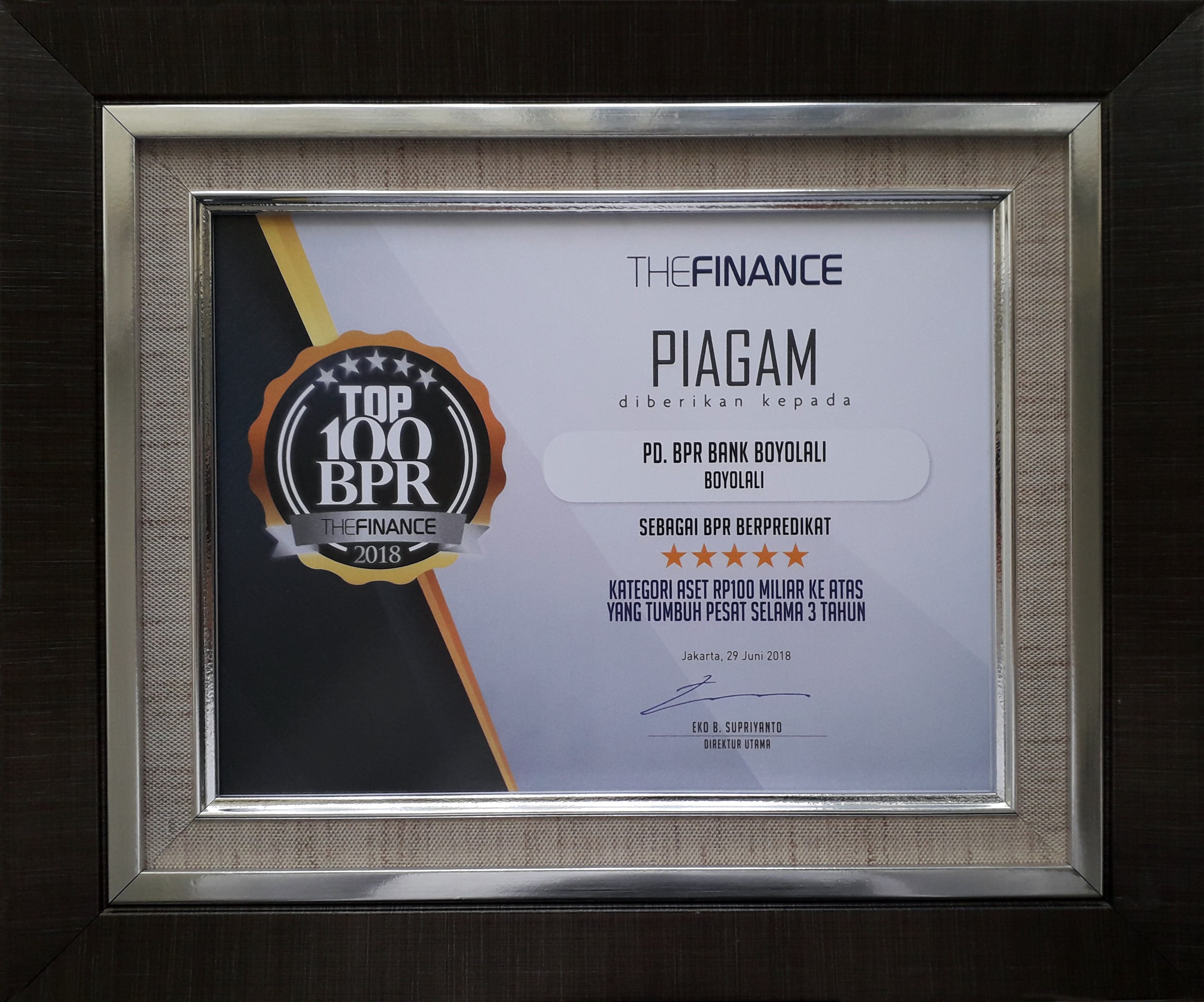 Pada kesempatan ini, PD. BPR Bank Boyolali mendapatkan penghargaan yang membanggakan yaitu sebagai BPR Berpredikat Bintang 5 untuk kategori Aset 100 Miliar Ke Atas Yang Tumbuh Pesat Selama 3 Tahun dan menempati Peringkat 8 Nasional serta peringkat 1 BPR Se Jateng-DIY. Piagam penghargaan diserahkan langsung oleh Ketua Umum Perbarindo, Bapak Joko Suyanto dan Direktur Utama The Finance Magazine Bapak Eko B. Supriyanto kepada Bapak Dono Sri Hananto, SE.MM selaku Direktur Utama PD. BPR Bank Boyolali.